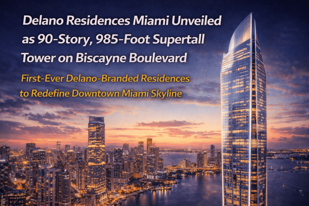 A new supertall tower is set to reshape the Downtown Miami skyline as Delano Residences Miami is officially announced as a 90-story, 985-foot luxury development along Biscayne Boulevard. The project marks the first standalone residential property under the Delano brand and represents another major milestone in Miami’s ongoing vertical growth.